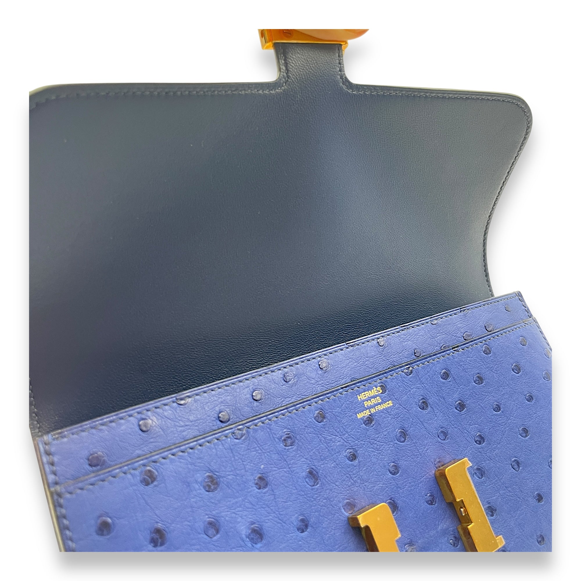 Be the first to review “Constance Blue Saphir Wallet on Chain in Ostrich, Gold hardware”